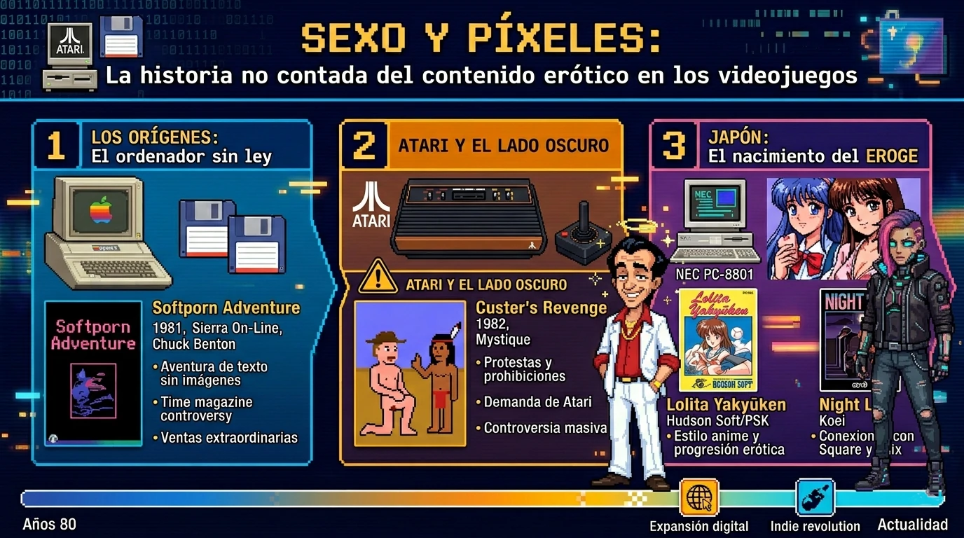 Desde el cine mudo hasta las plataformas de streaming, el contenido erótico ha seguido a cada nuevo medio de comunicación como su sombra más fiel. Los videojuegos no fueron la excepción. Casi desde el instante en que los primeros ordenadores personales llegaron a los hogares a finales de los años 70, alguien, en algún garaje o apartamento, ya estaba programando algo que no debía mostrarle a su madre. Esta es la historia de un capítulo incómodo, fascinante y a menudo ignorado de la industria del videojuego: el del contenido adulto, sus pioneros, sus controversias y su evolución hasta el presente.