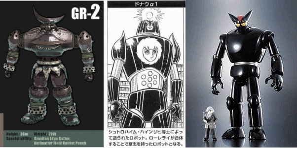 Kaneko: Sí. Realmente no pensé que hubiera otra opción. Si no introdujera algo con un linaje ligeramente diferente en este universo, no sería interesante. En mi caso, esas influencias fueron Black Onyx Tetsujin 28-go, el GR-2 de Robo gigante, y Danubio α1 de Mazinger.